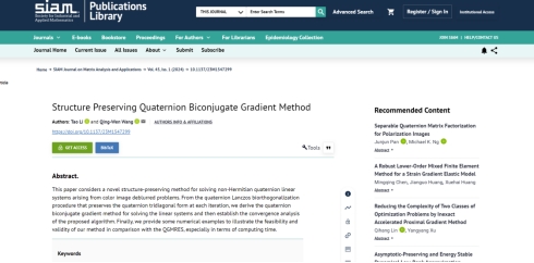 近日,77779193永利官网集团李涛博士以第一作者署名的文章“Structure Preserving Biconjugate Gradient Method”在国际数值代数领域权威期刊《SIAM Journal on Matrix Analysis and Applications》正式发表,文章链接https://doi.org/10.1137/23M1547299。
