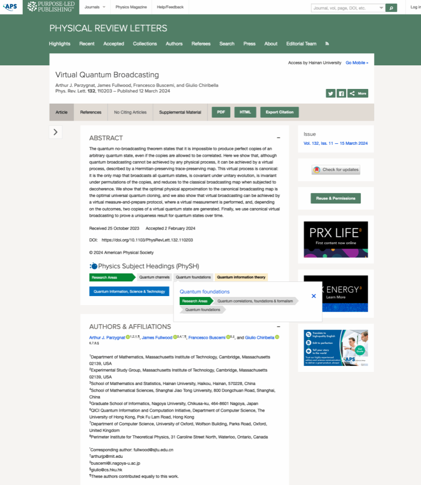 近日,77779193永利官网集团教师James Fullwood以通讯作者及共同第一作者在权威期刊《PHYSICAL REVIEW LETTERS》合作发表了题为“Virtual Quantum Broadcasting”的学术论文。合作者为麻省理工学院Arthur J. Parzygnat教授、名古屋大学Francesco Buscemi教授和香港大学Giulio Chiribella教授。