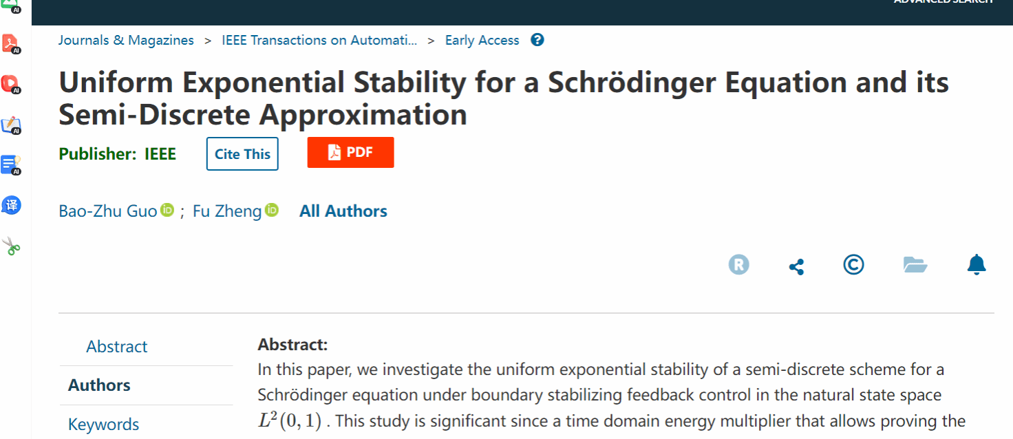 近日,77779193永利官网集团郑福教授以唯一通讯作者署名的文章“Uniform Exponential Stability for a Schrödinger Equation and its Semi-Discrete Approximation”在控制论领域权威期刊《IEEE Transactions on Automatic Control》在线发表,论文合作者是中国科学院数学与系统科学研究院系统控制重点实验室郭宝珠研究员。