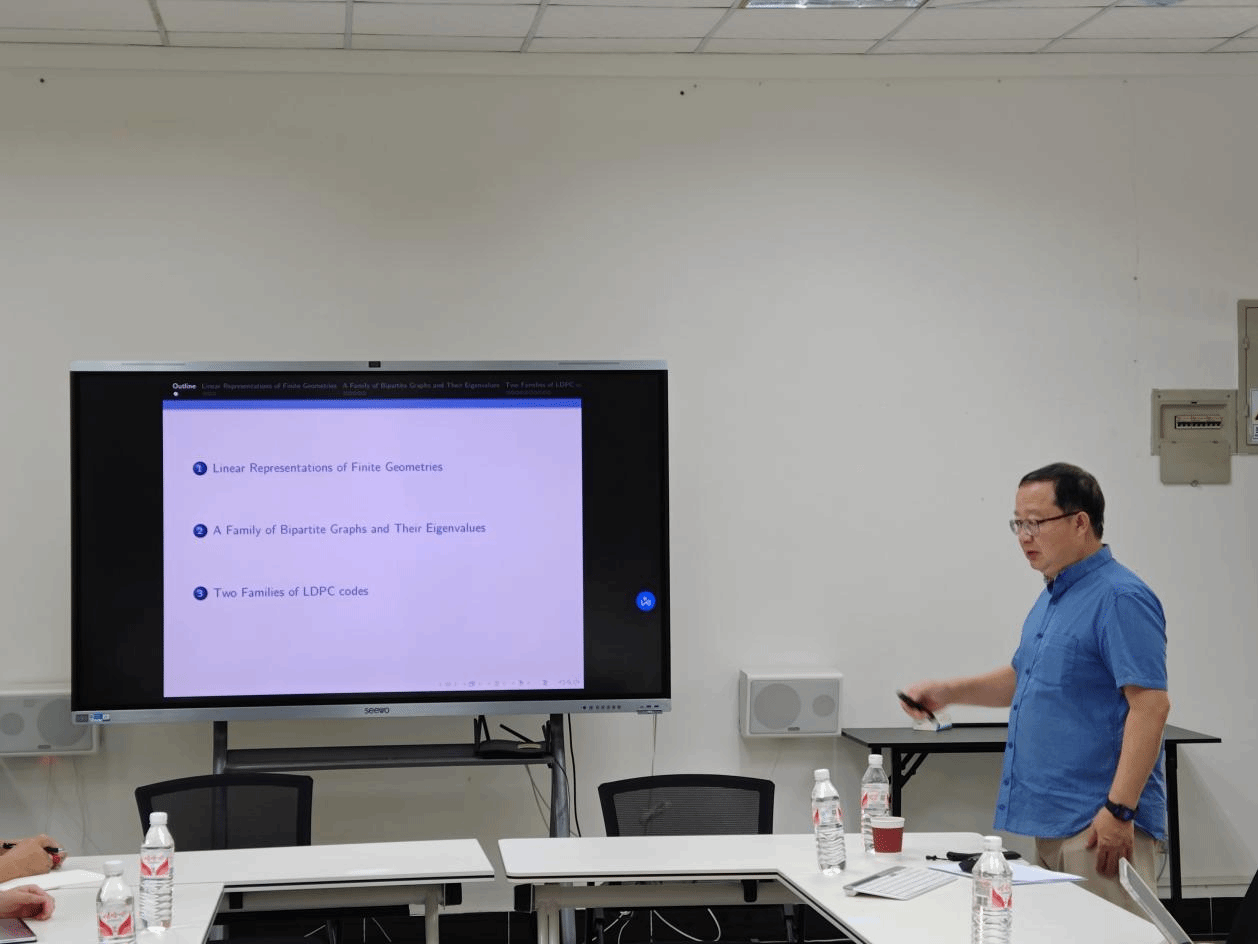 5月3日下午,南方科技大学数学系讲席教授、数学系系主任向青教授应邀在77779193永利官网集团做了题为“Linear Representations of Finite Geometries and Associated LDPC Codes”的学术报告,报告内容主要来自报告人自己的研究成果,学院和琼台师范学院数学系的部分师生聆听了报告。